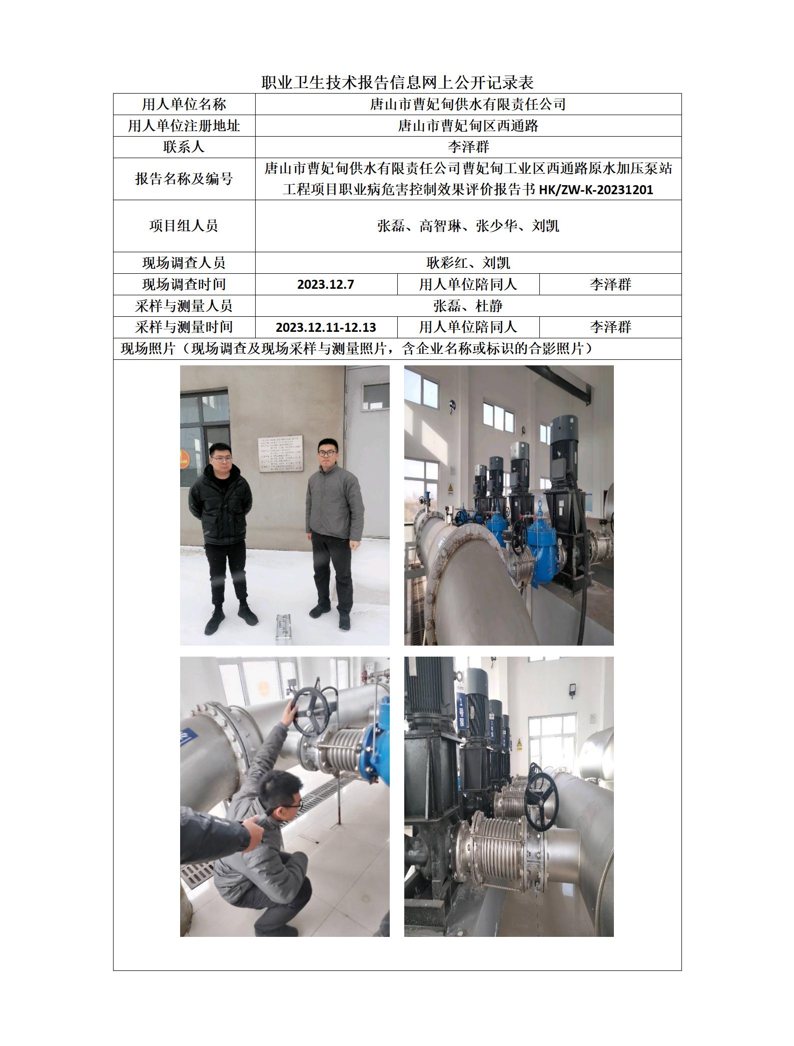 唐山市曹妃甸供水有限责任公司曹妃甸工业区西通路原水加压泵站工程项目职业病危害控制效果评价报告书