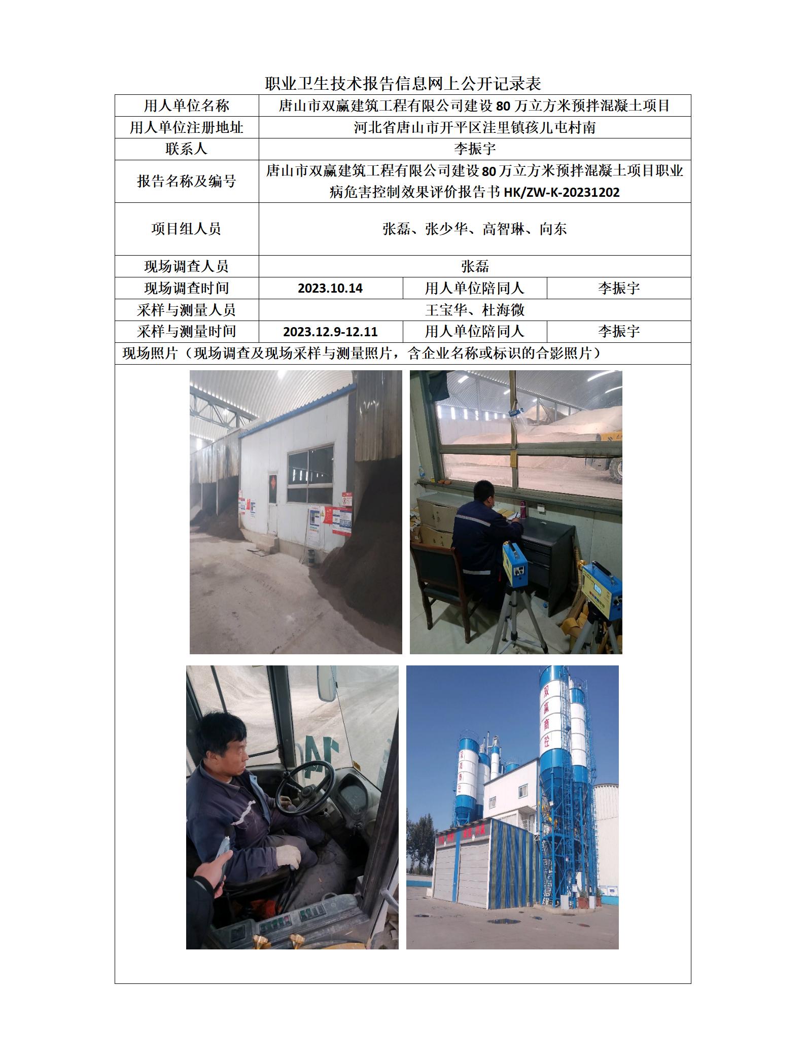 唐山市双赢建筑工程有限公司建设80万立方米预拌混凝土项目职业病危害控制效果评价报告书
